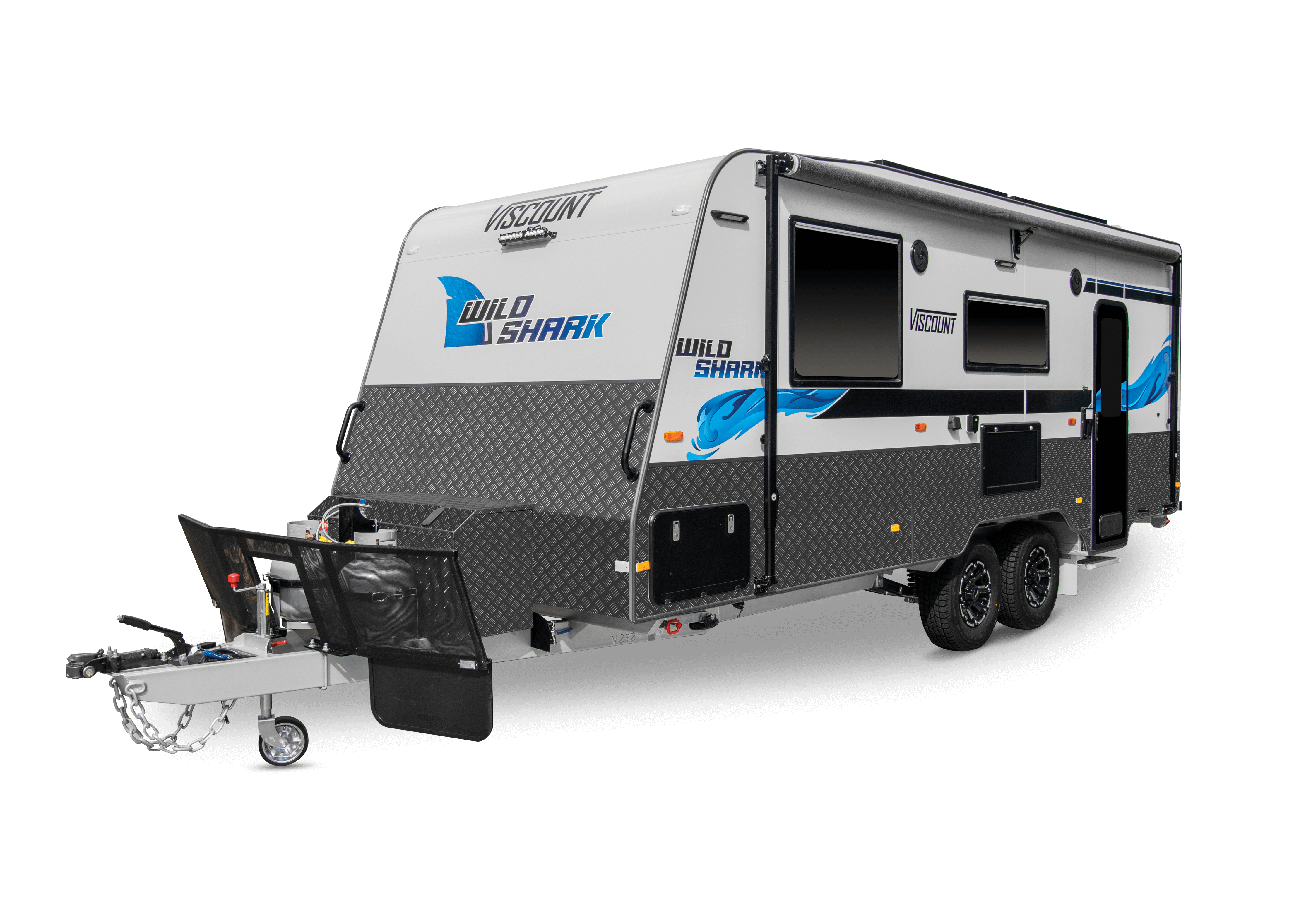 The new Viscount Wild Shark 3 is designed for every adventurer at heart. Key exterior features include the Heritage Grey Rear Composite Aluminium Panel, 550mm High Grey Checkerplate & Front/Back Panel, a spacious generator slide-out checkerplate toolbox, and upgraded lighting with powerful front and rear floodlights.