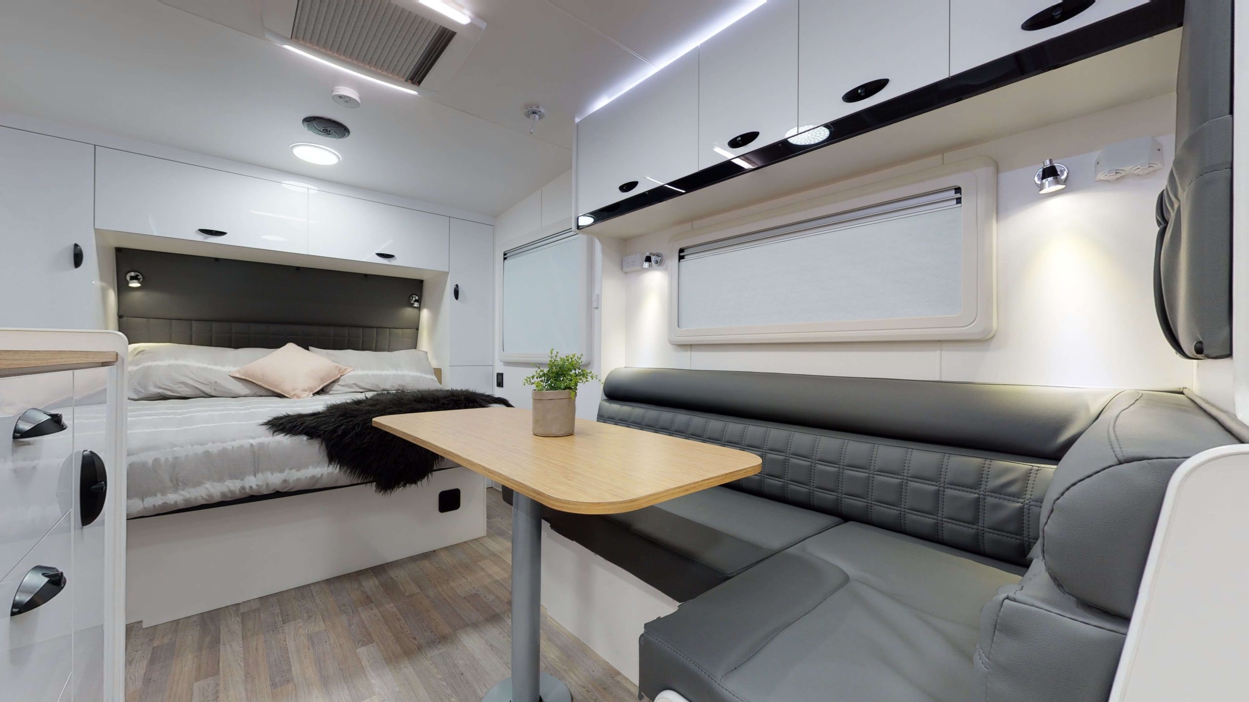 Get ready to be impressed as you enter the contemporary interior of the Wild Shark 3. It features sleek black tapware throughout, a stunning large black sink and vanity, premium upholstery with exquisite stitching, enhanced lighting, a BMPRO battery management system with a digital Trek Display, and Viscount Caravans’ signature computer-cut cabinetry with stylish dual-colour cupboard door options.