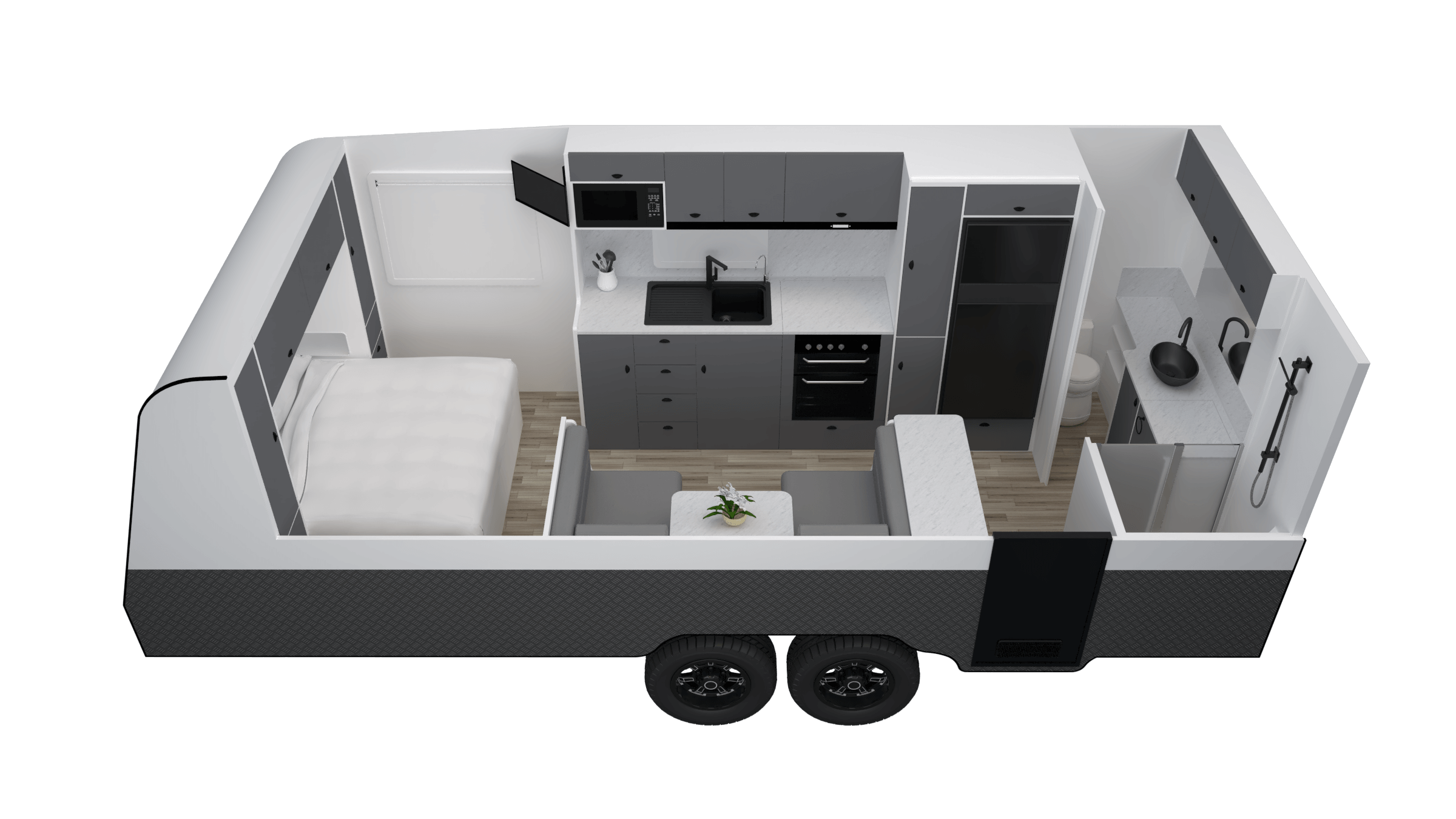 The new Viscount Wild Shark caters for every customer’s spirit of adventure. Highlights of the exterior include the mouse-grey composite aluminum exterior, 550mm high monument grey checkerplate sides, large generator slide-out toolbox and upgraded lighting including the front and rear flood lights.