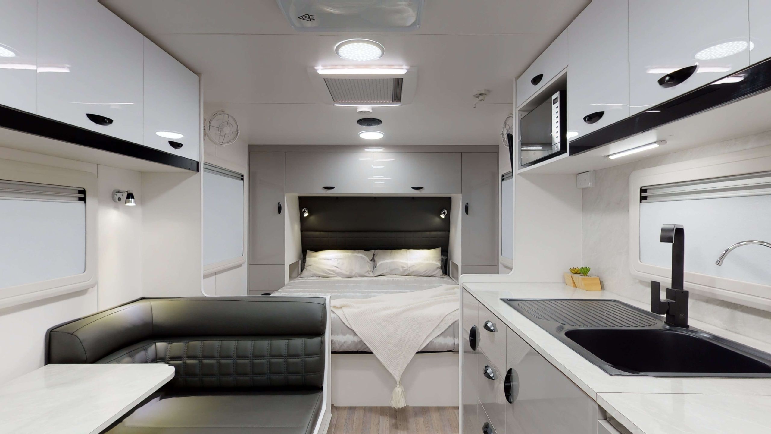 Prepare to be amazed as you step into the modern interior of the Wild Shark range. The range boasts black tapware throughout, a beautiful large black sink and vanity, premium stitched and framed upholstery, upgraded lighting, BMPRO battery management system with digital Trek Display and Viscount Caravans renowned computer-cut cabinetry with dual colour cupboard door options.