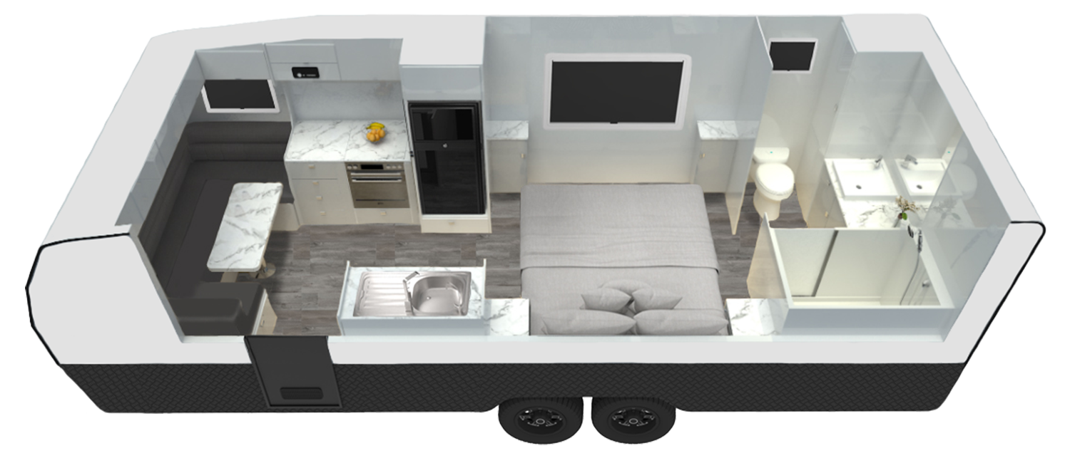 Your club lounge dinette is complimented with CNC machined dual sided, gloss or velvet gloss doors with all overhead doors fitted with concealed catches. With a range of colour choices to pick from, ample storage spaces, and a full ensuite you are spoilt with choices.